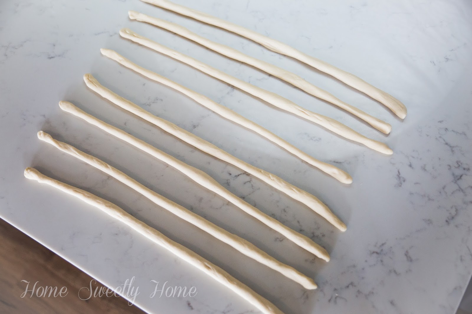 - Roll each piece into a rope and twist into a pretzel shape. *I also make pretzel bites and I just cut the rope into 1-inch pieces, the rest of the process is the same.